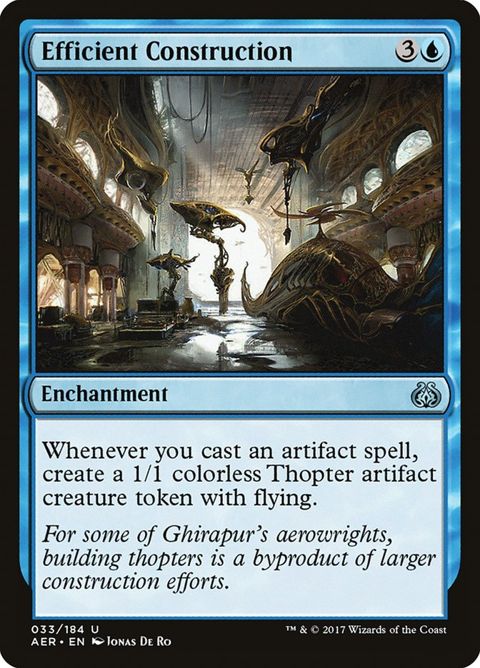 Aether Revolt Efficient Construction Enchantment Whenever you cast an artifact spell, create a 1/1 colorless Thopter artifact creature token with... Read more