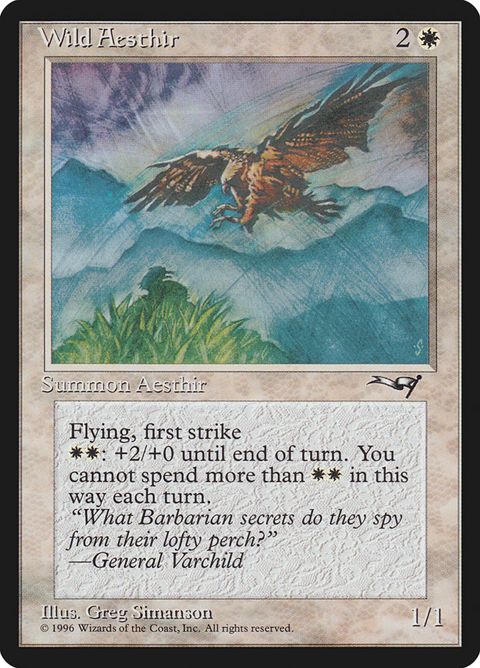 Alliances Wild Aesthir Creature — Bird Flying, first strike : This creature gets +2/+0 until end of turn. Activate only... Read more