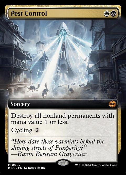 The Big Score Pest Control Sorcery Destroy all nonland permanents with mana value 1 or less.Cycling (, Discard this card:... Read more