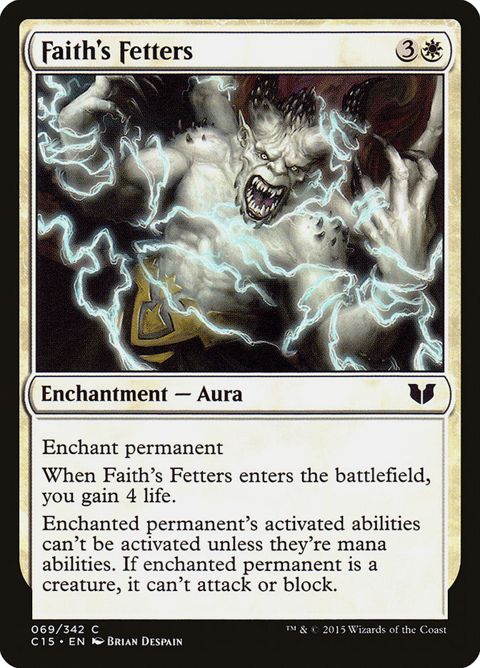 Commander 2015 Faith's Fetters Enchantment — Aura Enchant permanent When this Aura enters, you gain 4 life. Enchanted permanent can't... Read more