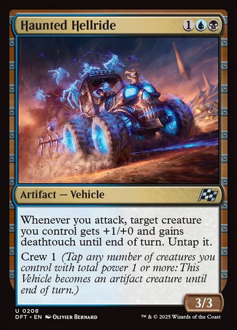 Aetherdrift Haunted Hellride Artifact — Vehicle Whenever you attack, target creature you control gets +1/+0 and gains deathtouch until end... Read more