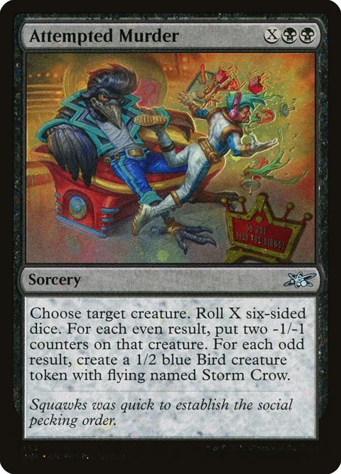 Unfinity Attempted Murder Sorcery Choose target creature. Roll X six-sided dice. For each even result, put two -1/-1 counters on... Read more