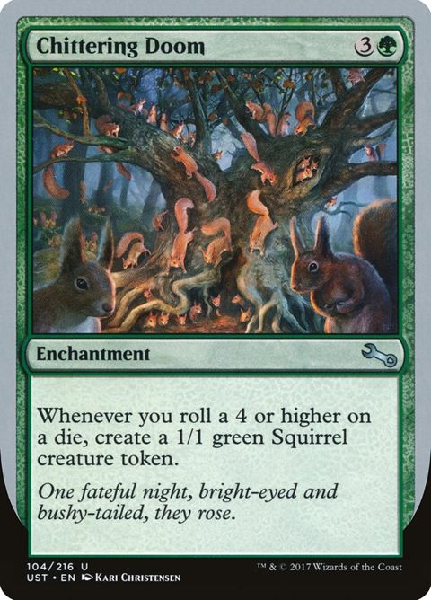 Unstable Chittering Doom Enchantment Whenever you roll a 4 or higher on a die, create a 1/1 green Squirrel creature... Read more